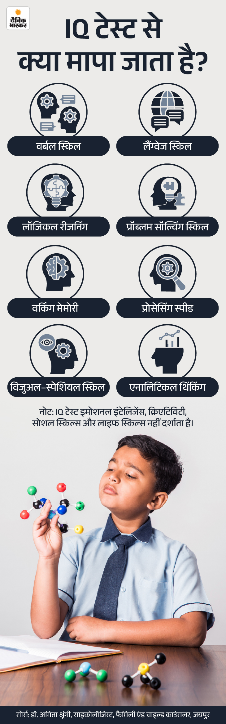 अमेरिकन साइकोलॉजिकल एसोसिएशन (APA) के मुताबिक, IQ टेस्ट इंटेलिजेंस के सिर्फ कुछ हिस्सों को ही मापता है। यह बच्चे के आसपास के वातावरण, सीखने की प्रक्रिया और पहले से मिली जानकारी से प्रभावित होता है।