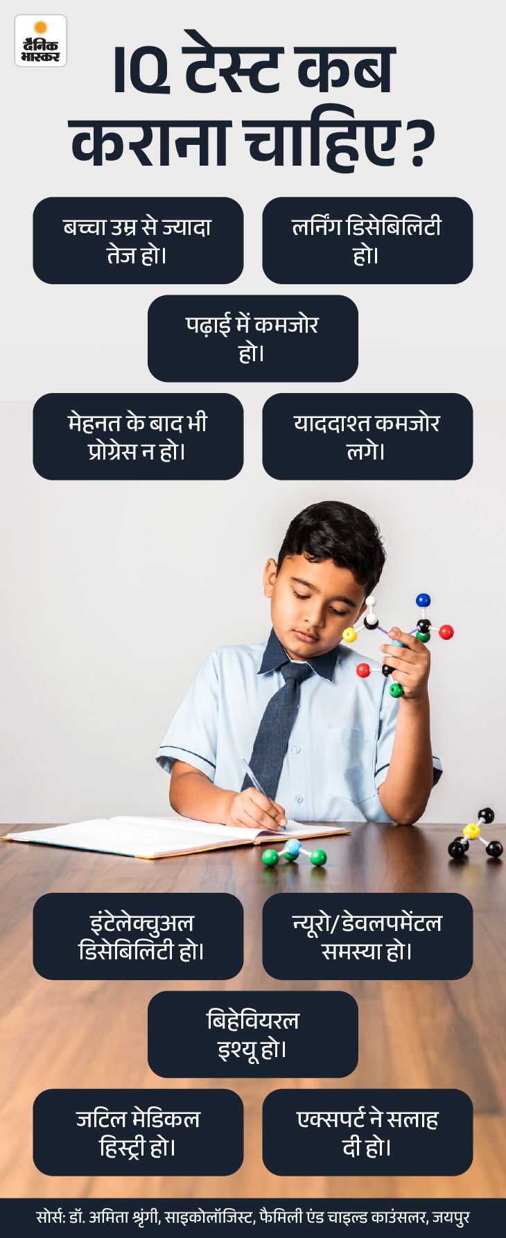 IQ टेस्ट हर बच्चे के लिए जरूरी नहीं है। अगर बच्चा सिर्फ एवरेज नंबर लाता है, फोकस में दिक्कत है या उसे मैथ मुश्किल लगती है तो IQ टेस्ट की जरूरत नहीं है। हालांकि कुछ स्थितियों में IQ टेस्ट कराना सही माना जाता है।